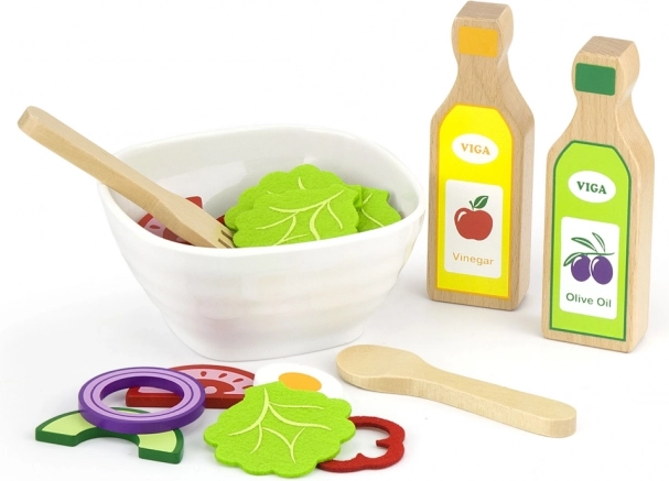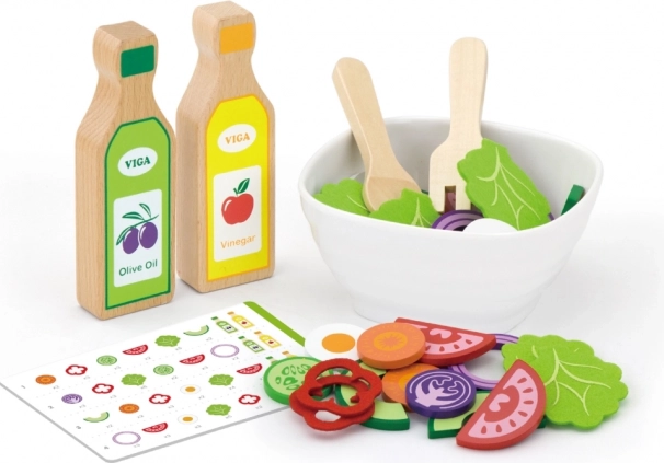 Ovaj kvalitetan drveni set za salatu donosi djeci realističnu kuhinjsku zabavu. Zahvaljujući bogatoj opremi mali kuhari mogu pripremiti vlastitu salatu, miješati sastojke u zdjeli i posluživati uz pomoć pribora. Igra potiče zdrave navike i prirodno uči prepoznavati različite vrste povrća.