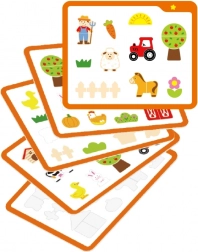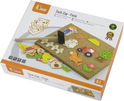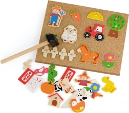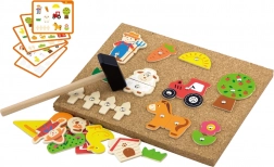 Šareni drveni oblici pričvršćuju se pinovima na čvrstu ploču od pluta – djeca slažu životinje, traktor i farmera prema vlastitoj mašti.