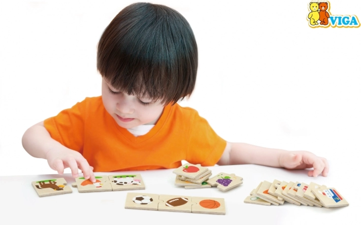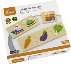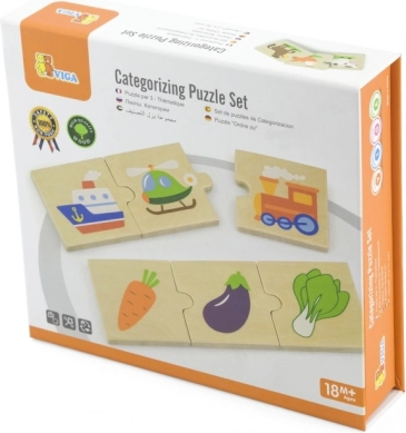 Drvene logičke puzzle VIGA spajaju zabavu i učenje. Djeca povezuju 24 dijela u 8 smislenih trojki – primjerice tri životinje, tri prijevozna sredstva ili tri vrste povrća. Time prirodno vježbaju prepoznavanje kategorija, koncentraciju i rječnik.