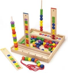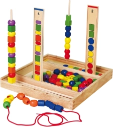 Djeca slažu i nižu perle na štapiće redoslijedom zadanim karticama. Vježbaju koordinaciju oko–ruka, strpljenje te prepoznavanje boja i oblika.