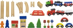 Tračnice, 2 lokomotive, 4 vagona, 3 autića i dodaci omogućuju stvaranje raznih pruga i scenarija – od jednostavne kružne rute do promišljenog grada.