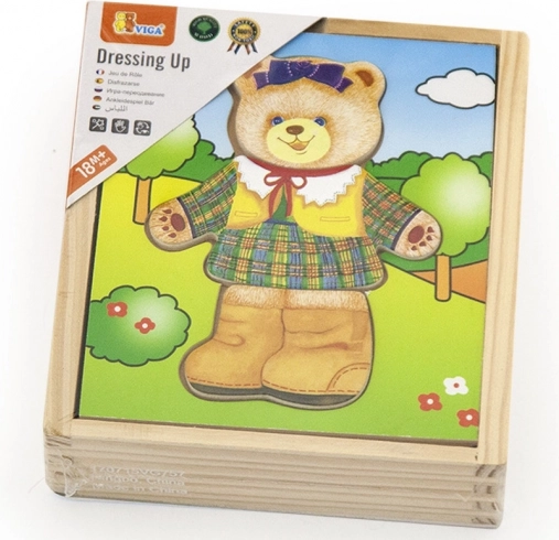 Viga drvene puzzle Obuci medvjedića – djevojčica: 18 dijelova, 6 varijacija. Razvijaju finu motoriku, logiku i prepoznavanje emocija. Praktična kutijica.