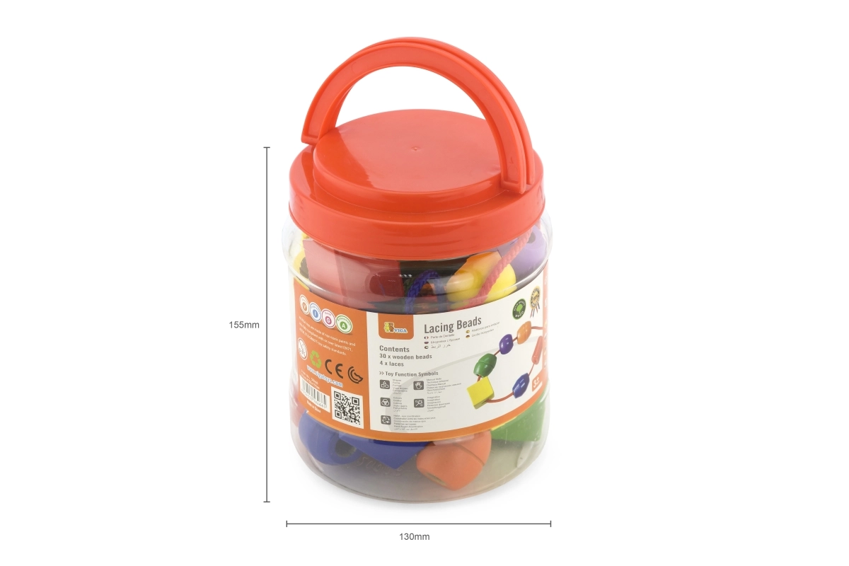 Velike drvene perle u praktičnoj kutiji s raznobojnim vezicama razveselit će svako dijete od 3 godine. Zahvaljujući ekstra veličini lako se hvataju i sigurno nižu, što potiče finu motoriku, koordinaciju oko–ruka i prepoznavanje boja i oblika. U pakiranju je 30 perli i 4 vezice za beskrajno stvaranje.