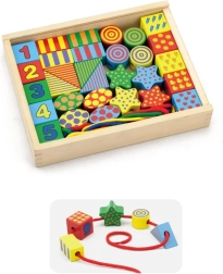 Ovaj drveni set za nizanje nudi djeci beskrajne mogućnosti stvaranja: nizanje poput perlica, slaganje tornjeva i kućica te razvrstavanje prema bojama i oblicima. Veliki dijelovi (oko 4 cm) lako se drže i idealni su za prva motorička vježbanja.