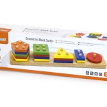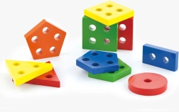 Set sadržava izrazito šarene geometrijske dijelove koje djeca lako hvataju i razvrstavaju prema obliku i boji.