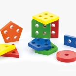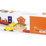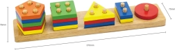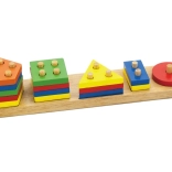 Ova čvrsta drvena slagalica s umetanjima kombinira razvrstavanje i nizanjenje oblika na klinove. Djeca uče razlikovati boje i geometrijske oblike, vježbaju koordinaciju ruka–oko i poboljšavaju spretnost pri rukovanju dijelovima. Drvo je glatko brušeno, a boje su žive i privlačne.