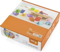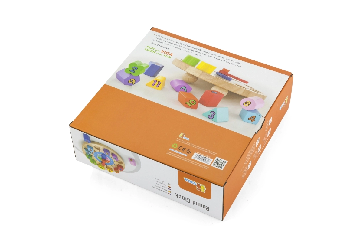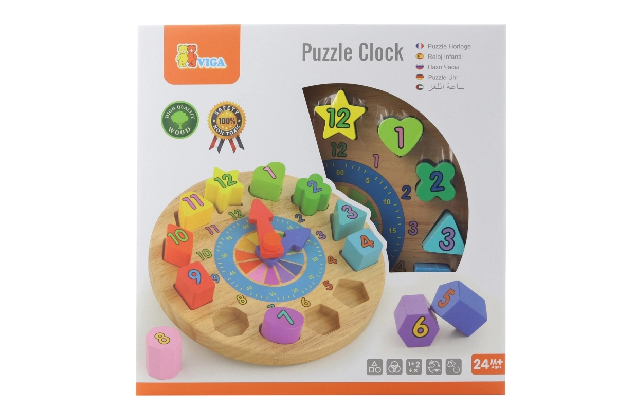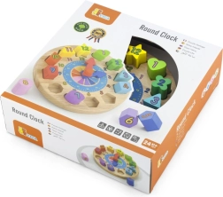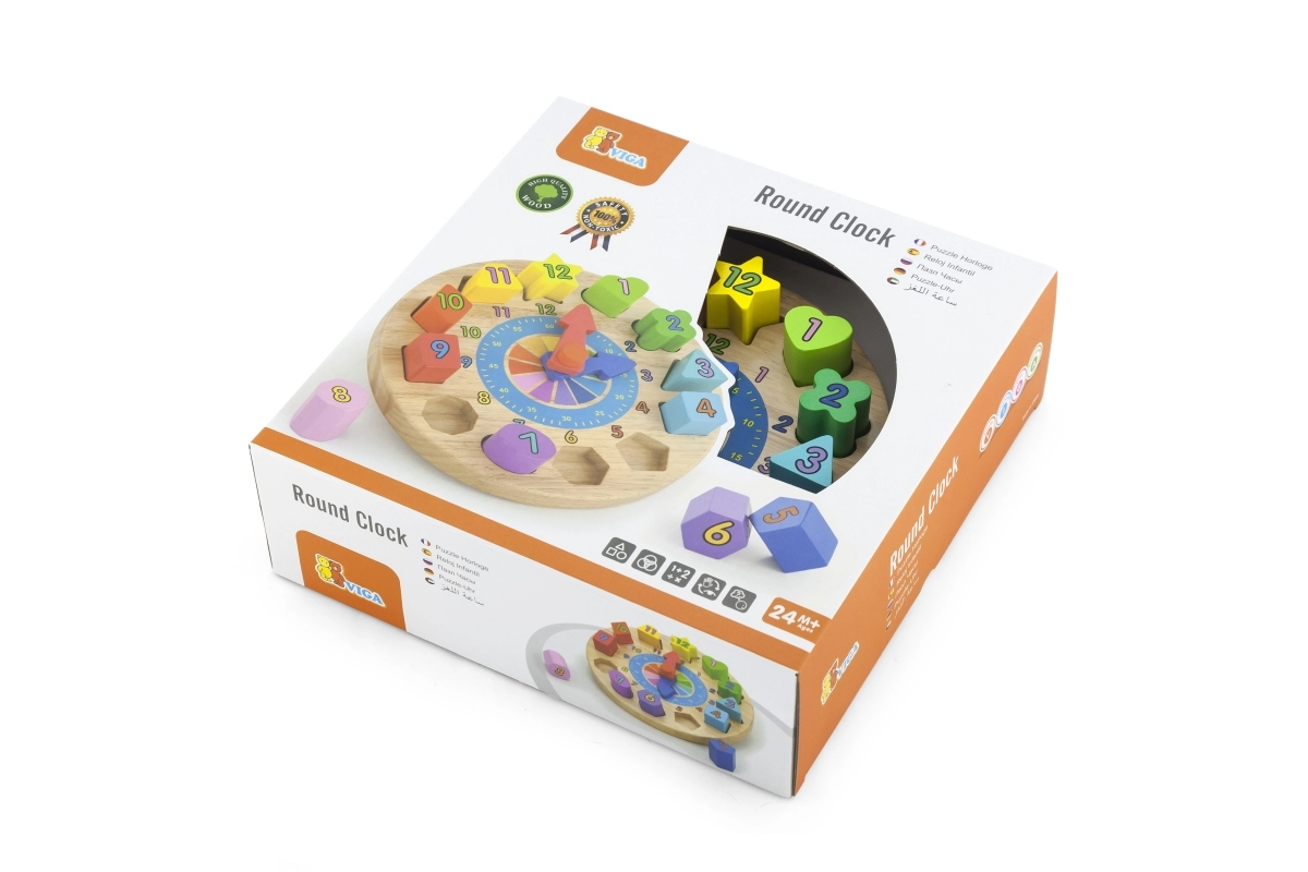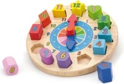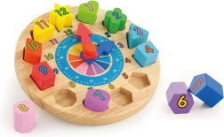 Zabavni i edukativni drveni sat za najmlađe pomaže učiti prepoznavati vrijeme, boje i oblike. Sadrži 12 šarenih umetaka s brojevima koji razvijaju finu motoriku, logiku i koordinaciju oko–ruka. Idealna igračka za djecu od 24 mjeseca.