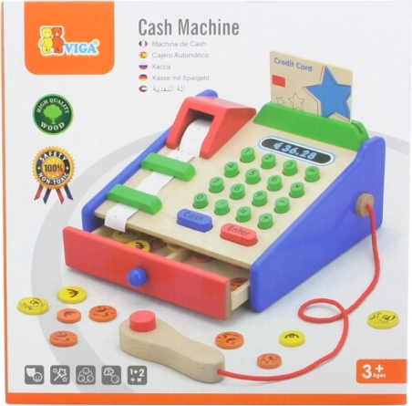 Priredite djeci zabavnu igru trgovine s kvalitetnom drvenom blagajnom VIGA. Set sadrži 40 kovanica, platnu karticu, skener na vrpci i rolu papira za “račune”. Podržava učenje računanja, društvene vještine i principe Montessorija u jednoj igrački.