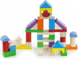 Šarene drvene kocke različitih oblika potiču djecu na slaganje i građenje, čime prirodno vježbaju hvat, koordinaciju oko–ruka i prostornu predodžbu.