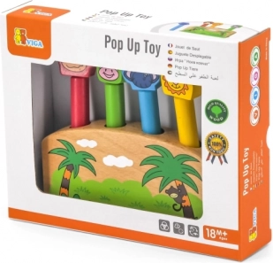 Ova drvena pop-up igra sa životinjama idealna je prva motorička igračka. Djeca umeću životinjske klinove u otvore i, nakon pritiska na oprugu, figurice zabavno iskoče. Robusna drvena baza s motivom džungle i prijateljske životinjice pozivaju na ponavljanu igru te razvijaju strpljenje i koncentraciju.