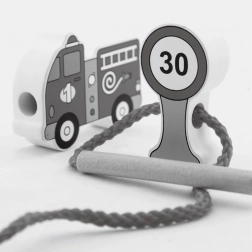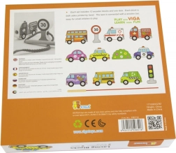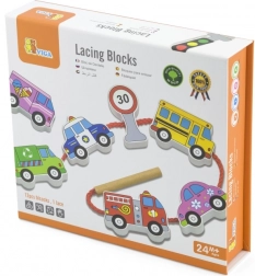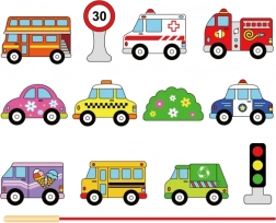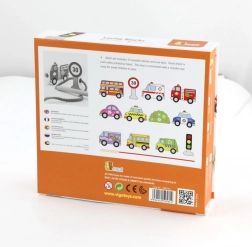 12 komada i uzica s drvenim štapićem omogućuju nizanje, slaganje i stvaranje priča o gradskom prometu.