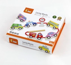 Ovaj kvalitetan drveni set za nizanje vozila donosi djeci radost učenja kroz igru. Sadrži 12 obostrano oslikanih elemenata s automobilima, autobusom, kolima hitne pomoći, vatrogasnim vozilom i prometnim znakovima te čvrstu uzicu sa štapićem za lako provlačenje. Djeca mogu stvarati vlastite priče o gradskom prometu, putovanjima i sigurnosti na cesti.
