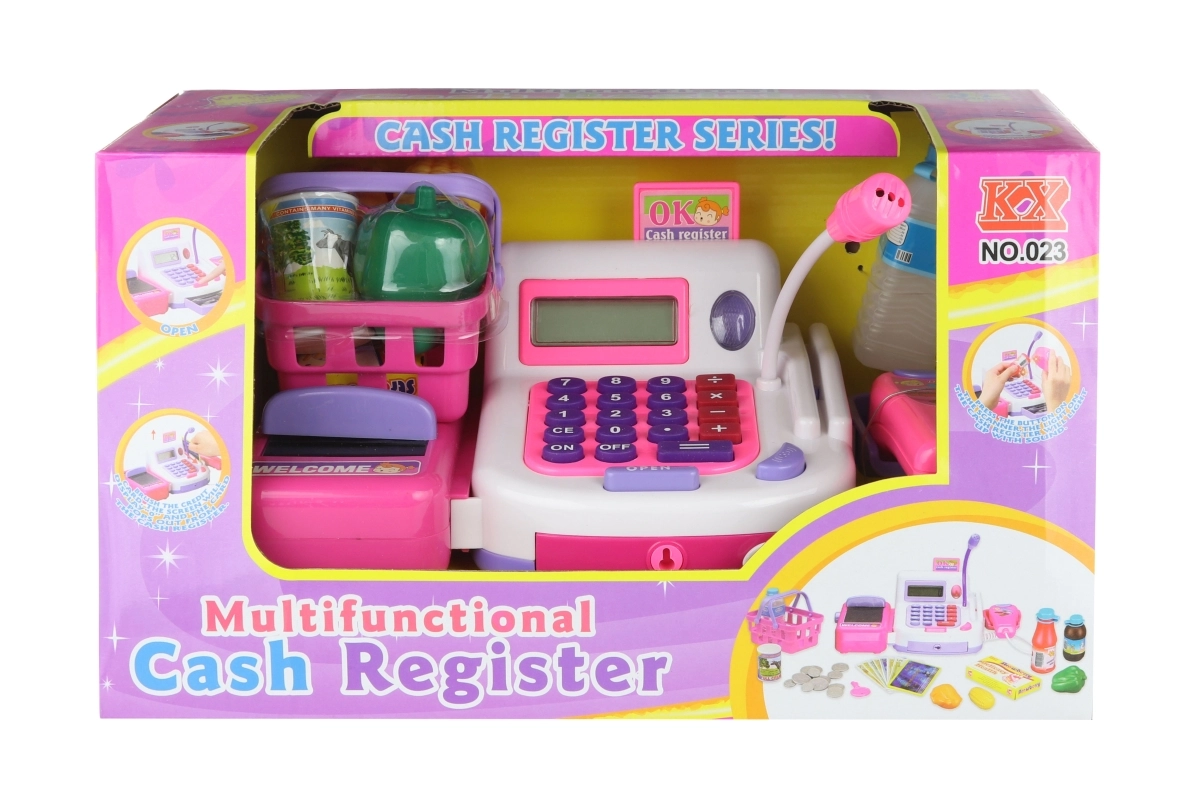 Blagajna je opremljena pokretnom trakom, čitačem i ladicom za novčiće. Djeca će tako vježbati osnovno računanje, komunikaciju i socijalne vještine. Napajanje osiguravaju 2× AA baterije (nisu uključene u pakiranje).