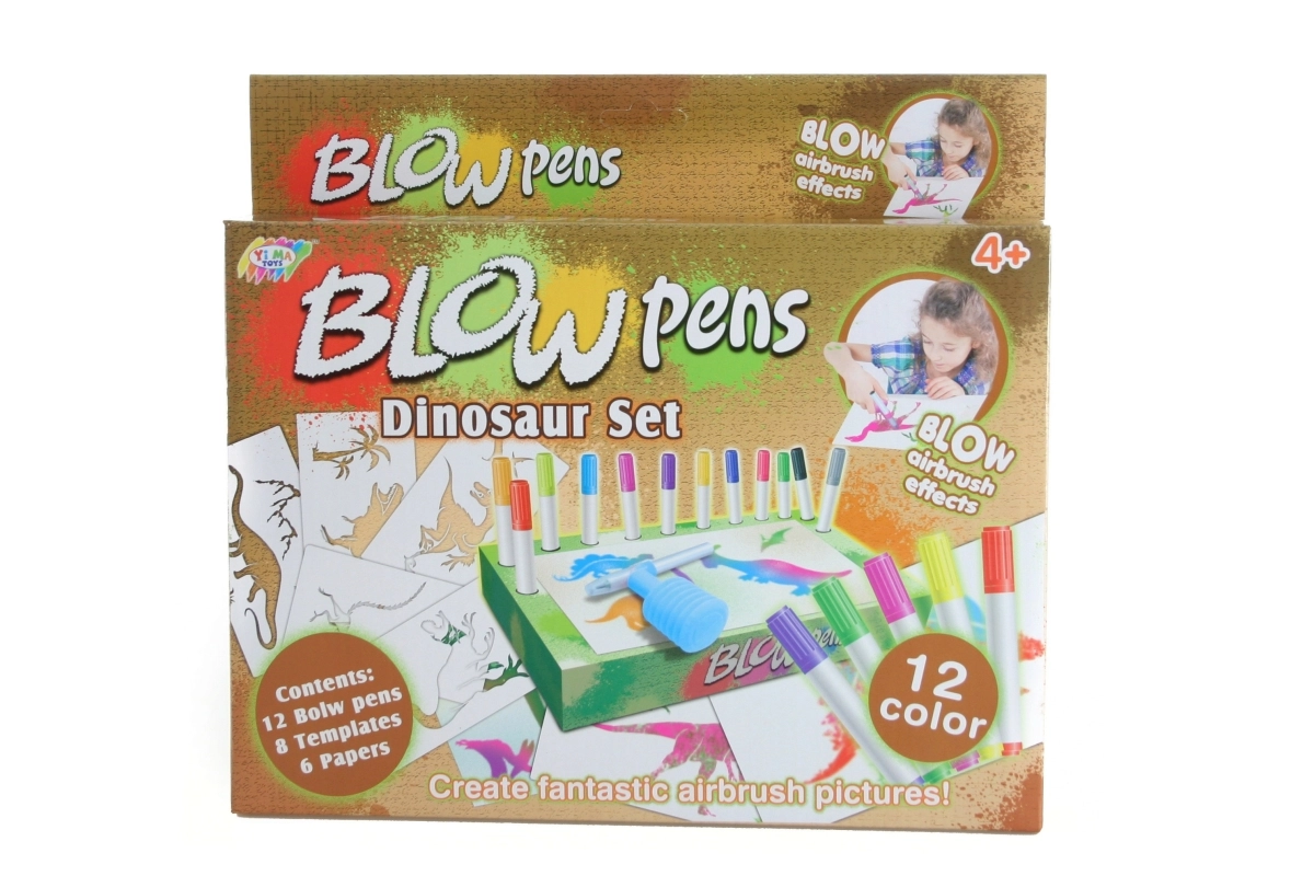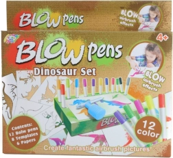 - 12 puhaljivih flomastera, 8 šablona, 6 papira, nastavak za puhanje s pumpicom, kartonsko postolje i držač za flomastere