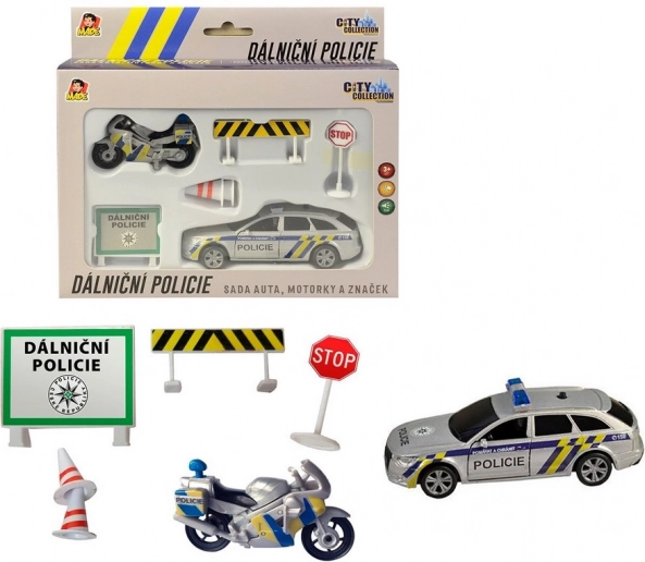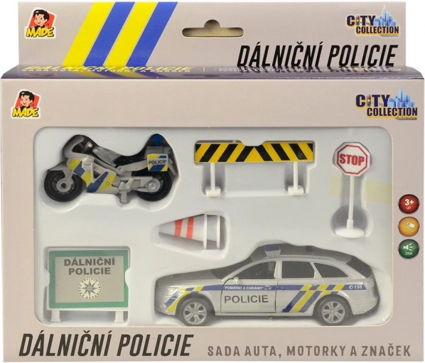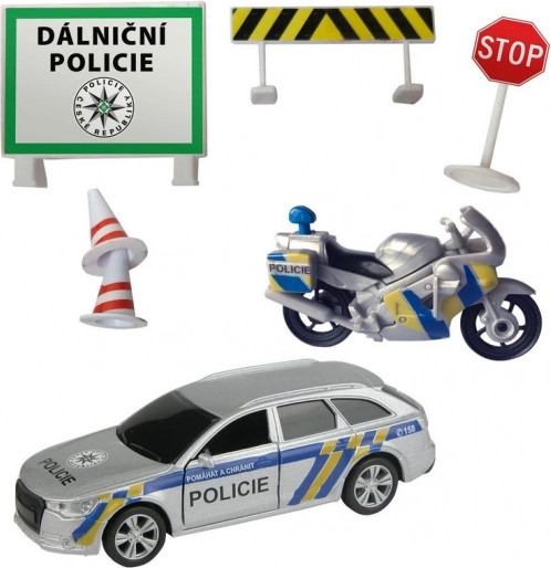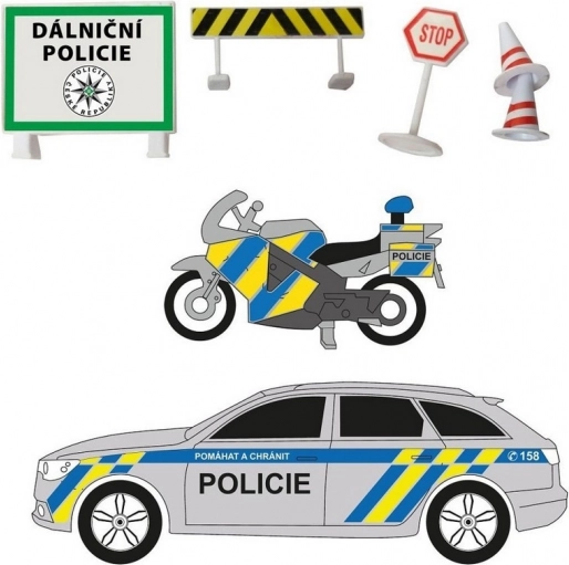 Ovaj set donosi autentičan doživljaj rada autocestne policije, kakvu poznajete s naših cesta. Metalni policijski automobil sa svjetlosnim i zvučnim efektima i plastični motocikl zajedno s prometnim znakovima potiču kreativnu igru i razvoj mašte. Zahvaljujući povratnom navijanju vozila se brzo pokreću i zabava može početi.