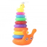 Zabavna slagalica za slaganje za najmlađe: plastični stup u obliku puža s raznobojnim prstenovima i veselom patkicom na vrhu. Potiče finu motoriku, koordinaciju oko–ruka i učenje boja i veličina. Idealno za djecu od 12 mjeseci.