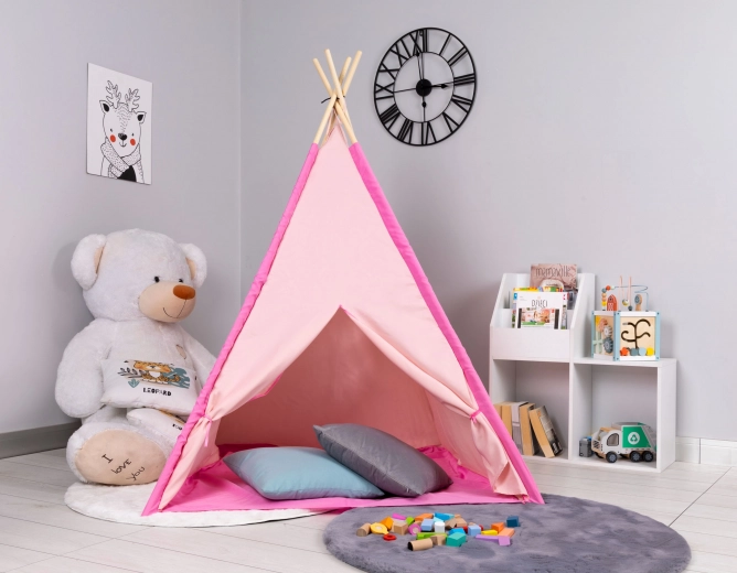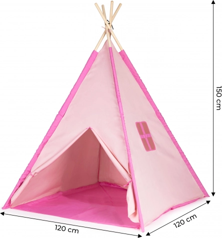 Šator teepee veličine cca 120 x 120 x 150 cm. Šator možete koristiti kod kuće u dječjoj sobi, ali i ljeti vani u vrtu. Djeca će se prilikom igre i skrivanja jako zabaviti. Dimenzije pakiranja cca 10 x 10 x 90 cm. Dob 3+ Boja: ružičasta/plava