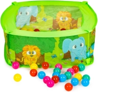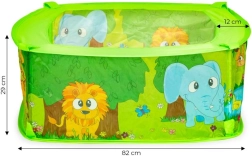Ogradica s dnom i 50 loptica – nije za vodu, dimenzija približno 75 cm x 75 cm x 30 cm. U pakiranju je 50 loptica. Bazen možete koristiti kod kuće u dječjoj sobi, ali i ljeti vani u vrtu. Djeca će se odlično zabaviti tijekom igre. Dob: 6 m+