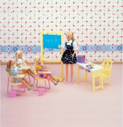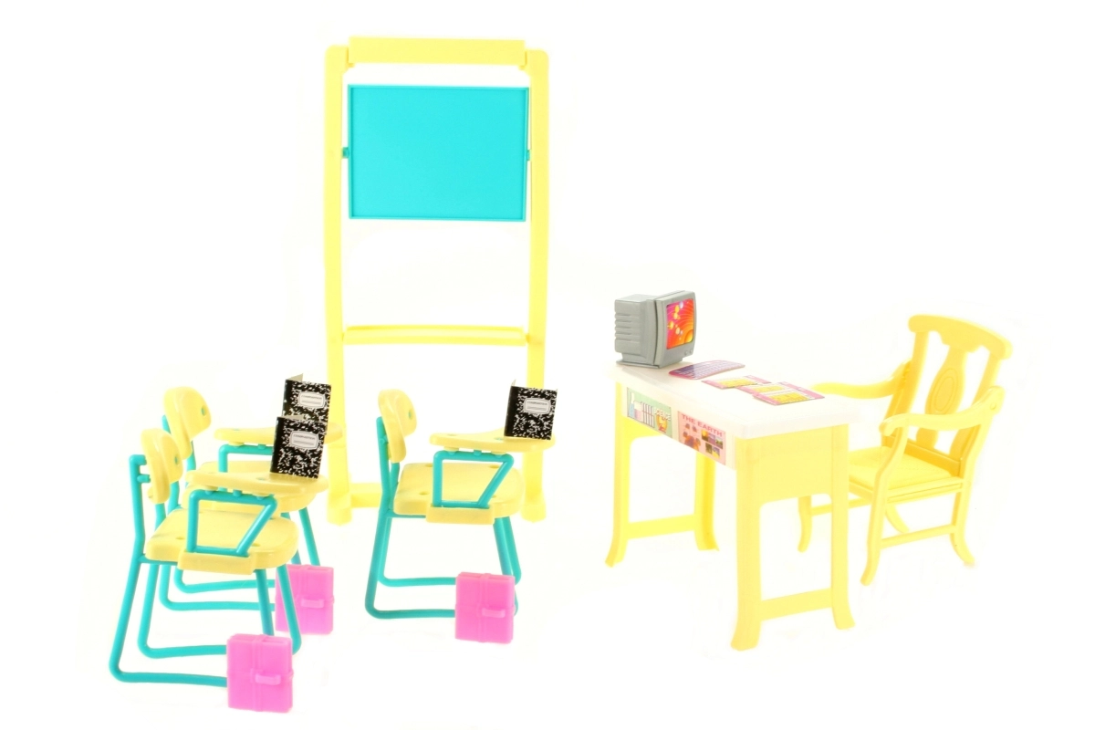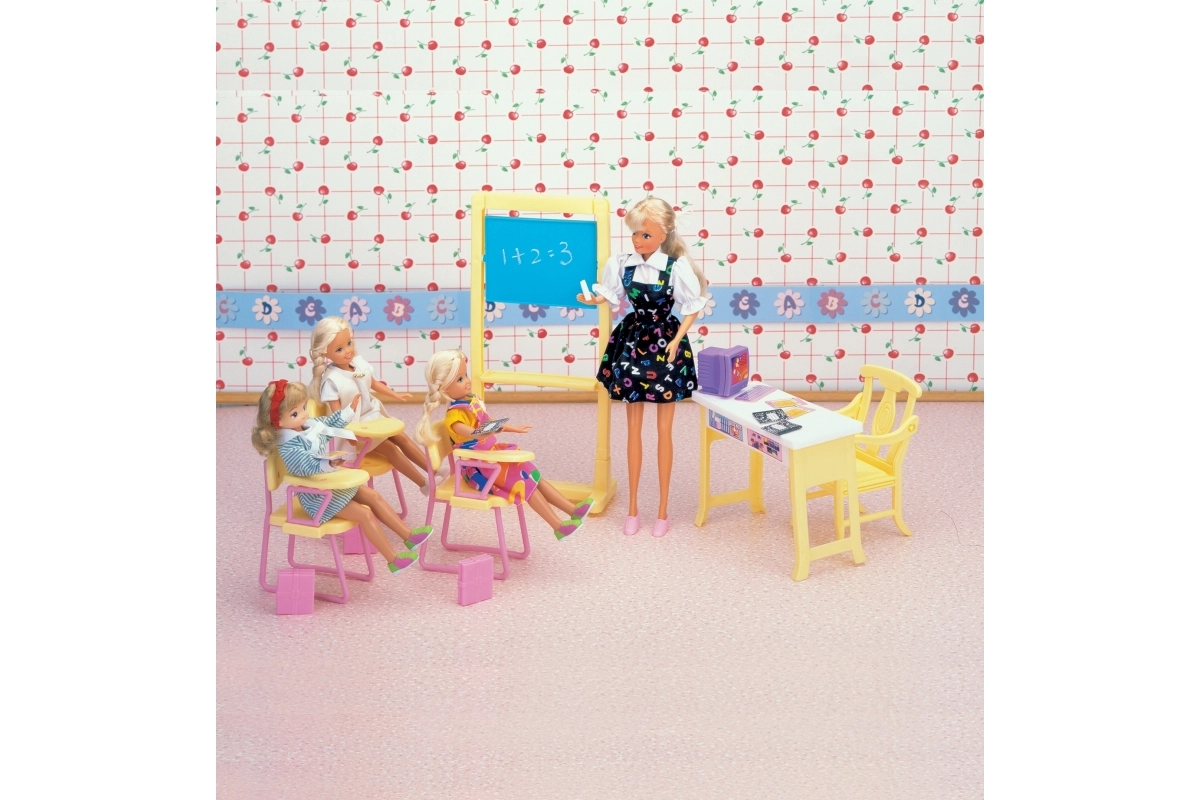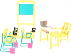U pakiranju se nalazi prostrana ploča, učiteljski kutak s računalom i stolice za učenike. Zahvaljujući kompaktnim dimenzijama, set je kompatibilan s uobičajenim lutkama i lako se sprema.