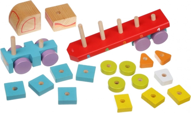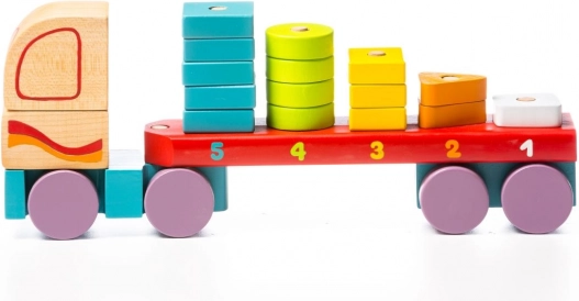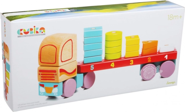Drvena slagalica CUBIKA Kamion s geometrijskim oblicima više je od obične igračke. S 19 šarenih dijelova djeca mogu učiti povezivati oblike i boje, što razvija njihove senzomotoričke sposobnosti. Svaki je dio dizajniran da se uklapa u druge, a napredniji graditelji mogu provjeravati točan broj posloženih dijelova prema brojkama na podvozju kamiona.