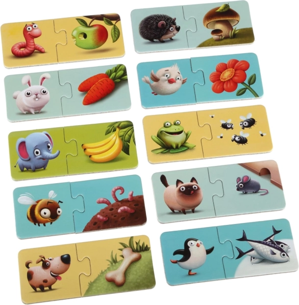 Ova logička igra uči djecu pravilno povezivati životinju s njezinom omiljenom hranom – primjerice slona, ježa, žabu ili crva. Nakon slaganja para djeca na zabavan način utvrđuju znanja o životinjama i njihovoj prehrani, a istodobno vježbaju zapažanje i koordinaciju oko–ruka.