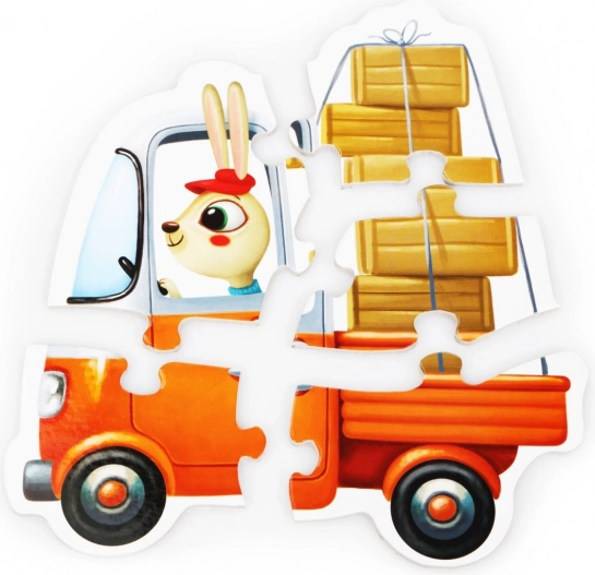 Složite pet šarenih vozila sa životinjama. Svaka slika ima 2–6 dijelova i podržava postupno učenje bez frustracije.