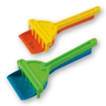 Praktičan set za male vrtlara sadrži lopaticu i grablje izrađene od izdržljive plastike. Idealan za igru u pješčaniku i u vrtu. Zahvaljujući kompaktnim dimenzijama dobro leži u ruci djeci od 3 godine. Boje su u mješavini i mogu se razlikovati ovisno o dostupnosti na skladištu.
