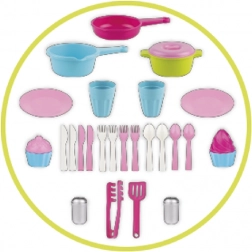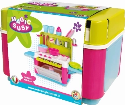 Ova pultna kuhinjica idealna je za putovanja i male dječje sobe. Zahvaljujući dvjema bočnim, nosivim i uklonjivim plohama nudi više prostora za igru, a ujedno se lako prenosi. Sastavni dio su pećnica s limom, ploča za kuhanje, sudoper s pipom i bogat set posuđa – sve za realističnu igru kuhanja.
