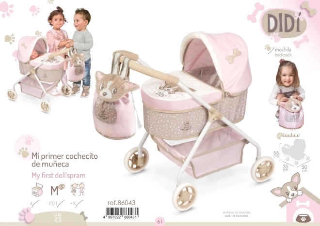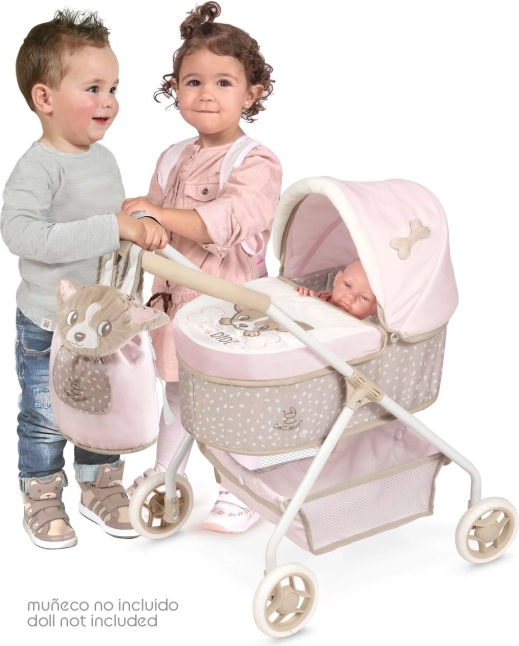 Priuštite djeci čarobnu igru s elegantnim kolicima za lutke u nježnim ružičasto-bež tonovima. Kombinacija glatkih tkanina i baršunastog veza psića daje kolicima premium izgled i dojam na dodir. Zahvaljujući laganoj konstrukciji i glatkim kotačićima lako se voze i u kući i vani.