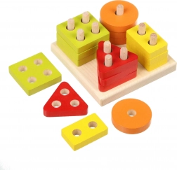 Dječja didaktička igračka CUBIKA Razvrstavamo oblike donosi 16 obojenih perforiranih geometrijskih dijelova i čvrstu kvadratnu bazu s klinićima. Djeca prirodno otkrivaju razlike između oblika i boja, vježbaju hvat i koordinaciju oko–ruka te razvijaju maštu i strpljenje. Pažljiva izrada od javorovog i bukovog drva te postojane, zdravstveno neškodljive boje na bazi vode jamče dug vijek trajanja i sigurno igranje.