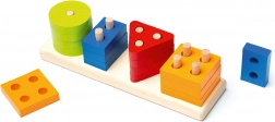 Ova kvalitetna drvena slagalica nudi 16 obojenih geometrijskih oblika koji se nižu na klinove na pravokutnoj podlozi. Djeca se kroz igru uče prepoznavati boje i oblike, isprobavaju različite kombinacije te prirodno vježbaju koordinaciju i strpljenje.