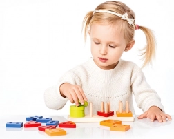 Nizanje dijelova na klinove jača koordinaciju oko–ruka, preciznost hvata i koncentraciju – ključne vještine za predškolski uzrast.