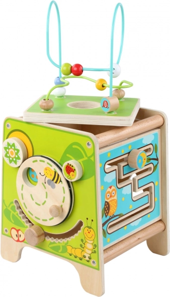 Ova šarena drvena aktivna kocka donosi djeci sate smislenog igranja. Gornji labirint s perlicama može se izvaditi i okrenuti prema unutra radi lakšeg spremanja. Na bočnim stranama djeca otkrivaju ksilofon s batićima, umetaljku dvodijelnih rotirajućih geometrijskih oblika, motorički labirint, rotirajući kotačić, okretne elemente te zabavnu igru s pomicanjem klina u utoru.