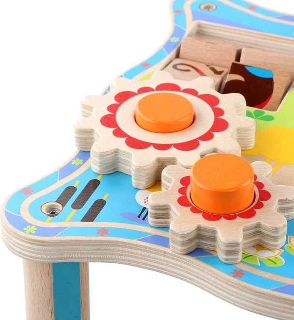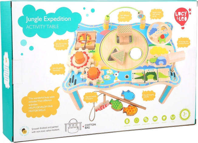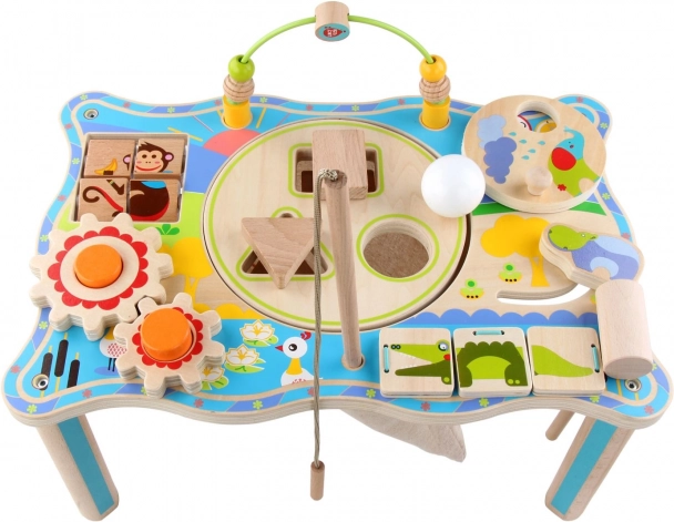 Drveni stolić s motivima džungle spaja zabavu i učenje te potiče finu motoriku, koordinaciju oko–ruka i logičko razmišljanje. Djeca mogu okretati zupčanike, pomicati perlice po stazi, vježbati snagu i koncentraciju uz igru čekićem te uvježbavati prepoznavanje oblika zahvaljujući umetaljci. U sredini je lanena vrećica za ulovljene ribice i igraće dijelove, koja održava igraću plohu urednom.