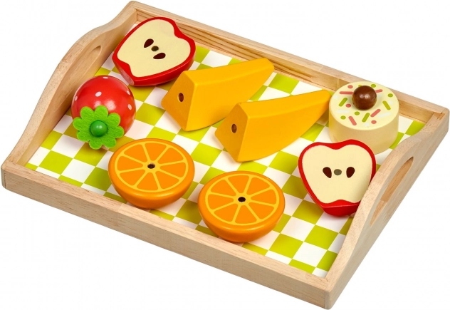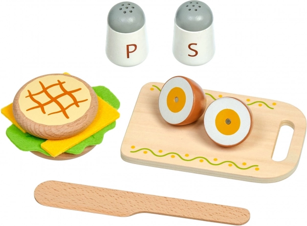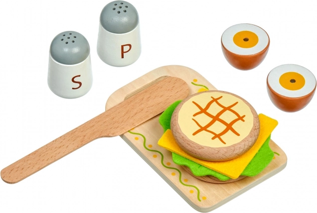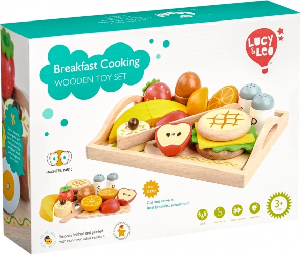Ovaj drveni set vjerno oponaša bogat doručak na pladnju i poziva djecu na beskrajnu dozu mašte. Pojedini dijelovi namirnica spojeni su magnetima, pa ih djeca mogu iznova „rezati“ drvenim nožem na dasci i ponovno slagati. To potiče prirodno učenje, koordinaciju ruka-oko i oponašanje aktivnosti odraslih.