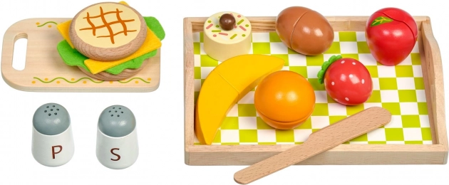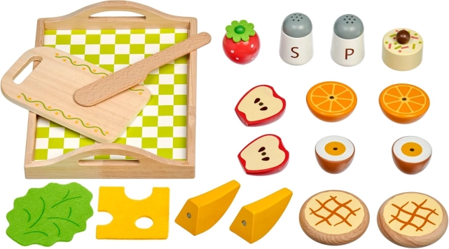 Set sadrži sve za male kuhare: pladanj s kariranim uzorkom, dasku, nož, soljenku i paprenku, kao i raznolik izbor namirnica – pecivo, sir i salatu, jaje, bananu, jabuku, naranču, jagodu i mali kolačić. Naglasak na kvalitetnim materijalima i izdržljivoj izradi jamči dug vijek trajanja i sigurnu igru.