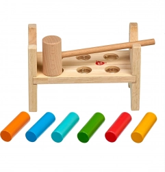 Šest šarenih čavlića i drveni čekić uče djecu preciznom hvatu, jačini udarca i koordinaciji oko–ruka.