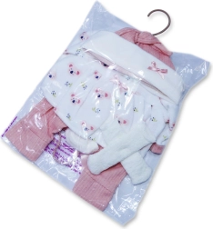 Četverodijelni set uključuje kapicu, odjeću, hlače i čarapice u usklađenim bojama, tako da će lutka uvijek biti lijepo usklađena i na toplom.
