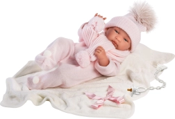 Stilskom 3-komadnom odjećom za lutku bebu New Born marke Llorens, veličine 43-44 cm, uključena je ukrasna deka od flisa s mašnom. Proizvedeno u Španjolskoj, pruža savršen izgled za vaše lutke.
