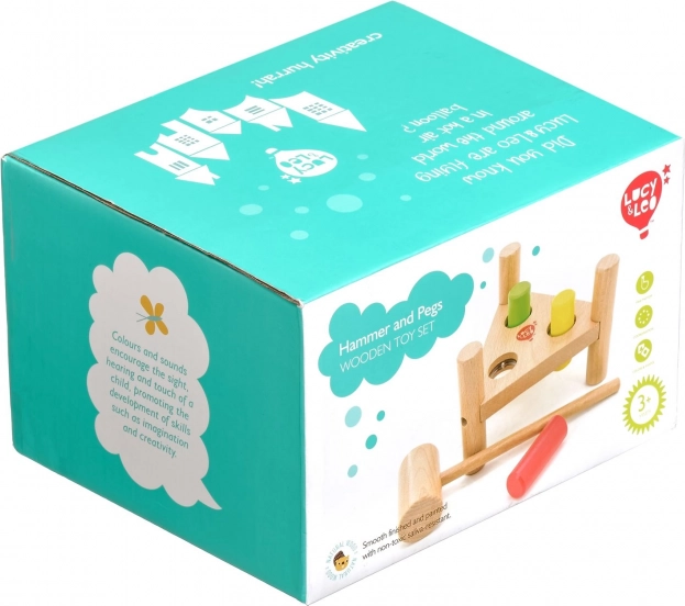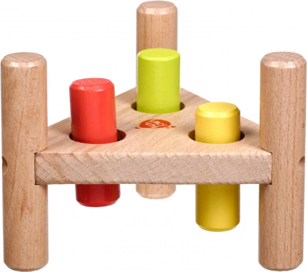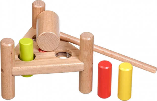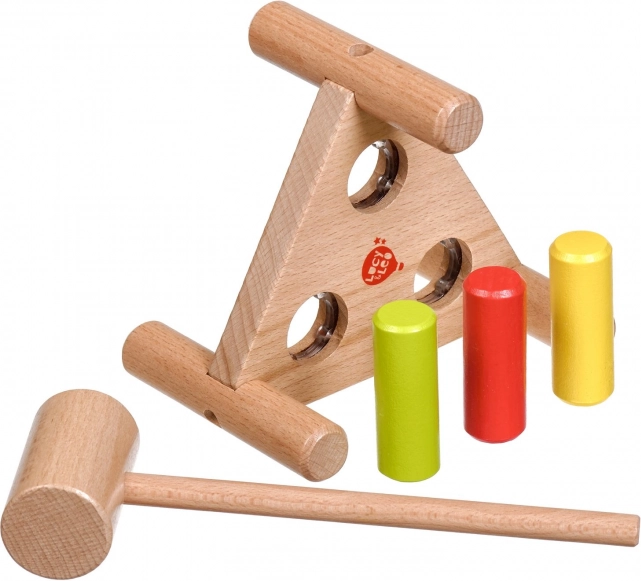 Zabavna drvena čekićarka u netradicionalnom trokutastom obliku potiče finu motoriku, koordinaciju oko–ruka i koncentraciju. Tri obojena klina lako se zabijaju drvenim čekićem, a nakon što su zabijeni, dovoljno je postolje okrenuti i zabava može početi iznova.