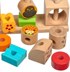 Stabilno postolje i tri klina olakšavaju pravilno slaganje dijelova. Djeca vježbaju finu motoriku i koordinaciju ruka–oko pri nizanju i slaganju.