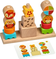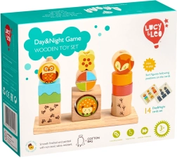 Set sadrži čvrstu drvenu osnovu, raznolike kocke različitih veličina i 14 obostranih karti sa zadacima. Na kockama s motivima životinja nalaze se verzije „dan” i „noć”, što igri daje pripovjednu dimenziju. Nakon igre sve lako spremite u lanenu vrećicu.