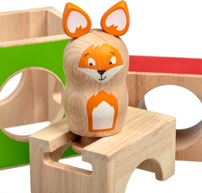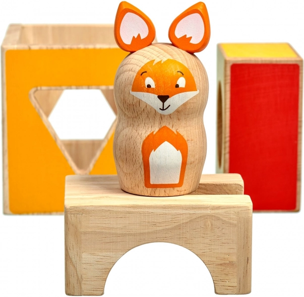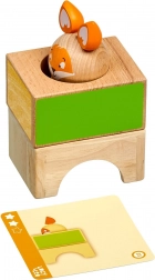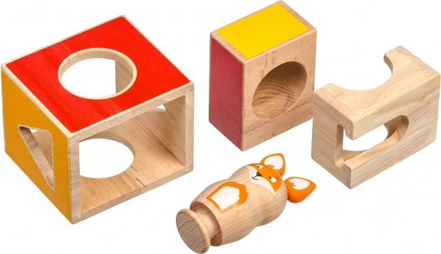 Ova drvena obrazovna igra sadrži tri masivne kocke s izrezima različitih oblika, drvenu figuru lisice i set obostranih karata sa zadacima različite težine. Djeca prema predlošcima slažu i kombiniraju kocke tako da se lisica ispravno “sakrije”, čime treniraju strategiju i prostornu percepciju.