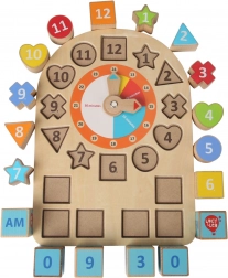 Drvena edukativna ploča LUCY & LEO kombinira slagalicu sa satom. Djeca slažu šarene oblike s brojevima oko brojčanika, okreću kazaljke i tako uče analogno i digitalno vrijeme. Zahvaljujući AM/PM kockama lako shvaćaju razliku između prijepodneva i poslijepodneva te mogu uvježbati i engleske oznake vremena.