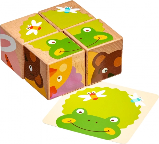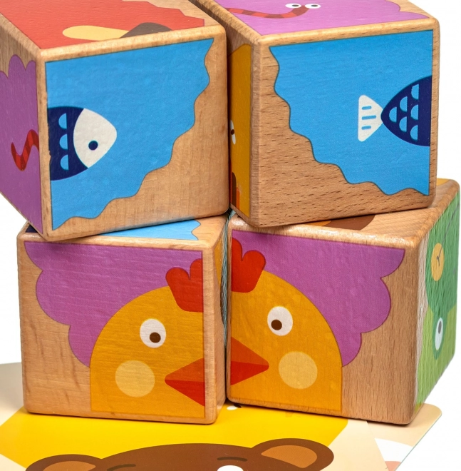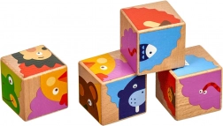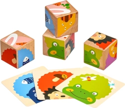 Od četiri drvene kocke djeca mogu složiti čak šest različitih slika prema priloženim predlošcima. Svako okretanje donosi novi, zabavni zadatak i održava pažnju malih graditelja.