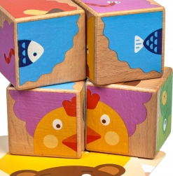 Kocke su izrađene od kvalitetnog drva i imaju sigurnu, netoksičnu i na slinu otpornu završnu obradu. Žive boje i prijateljske ilustracije privlače na prvi pogled i potiču učenje boja i naziva životinja. Idealna opcija za prve puzzle za djecu od 3 godine.