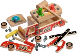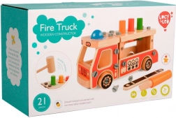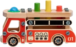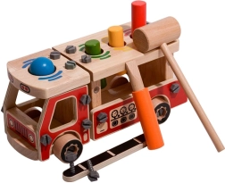 Ovaj kreativni set spaja građevnu set-konstrukciju i čekić u jednom. Djeca najprije sastave robusno drveno vatrogasno vozilo, a potom na njegovoj platformi koriste četiri otvora za zabavno zakucavanje obojenih elemenata čekićem. Zahvaljujući živim bojama i raznolikim oblicima, igračka potiče prirodno učenje i koncentraciju.