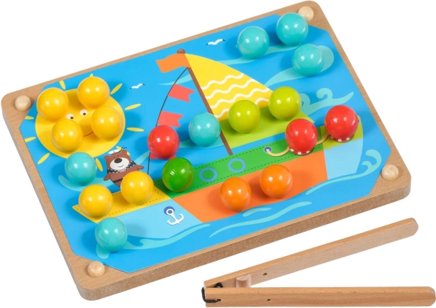 Drvena podloga s rupama, šareni čepići i pinceta potiču djecu na precizan hvat te vježbaju finu motoriku i koordinaciju oko–ruka.