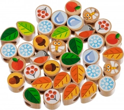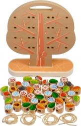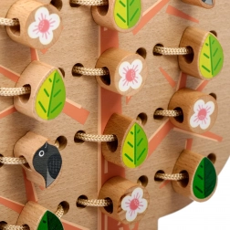 Ovaj kvalitetan drveni set donosi djeci zabavno provlačenje i vezanje na čvrstoj ploči stabla s postoljem. Sadrži šarene dijelove (listove, cvjetove, bobice, žirove, voće, pahulje, kukce itd.) i nekoliko vezica za beskrajne kombinacije. Dijelovi se nakon igre mogu spremiti u praktičnu lanenu vrećicu.