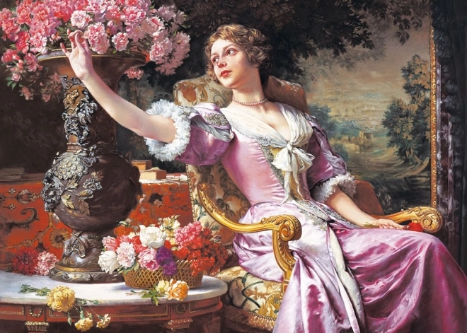 3 000 dijelova prikazuje elegantnu sliku žene u prekrasnoj ljubičastoj haljini, okruženu cvijećem.